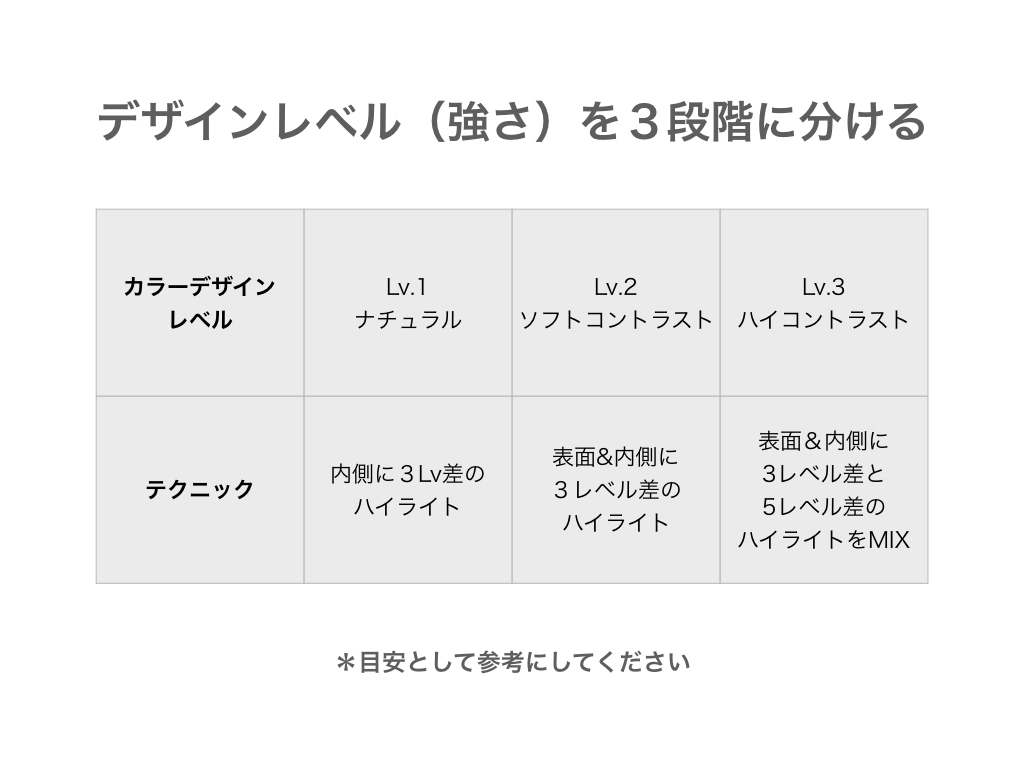 「お客様がこういう希望だから、ソフトコントラストでネープにはちょっと多めに。12レベルのハイライトをお願いね!」