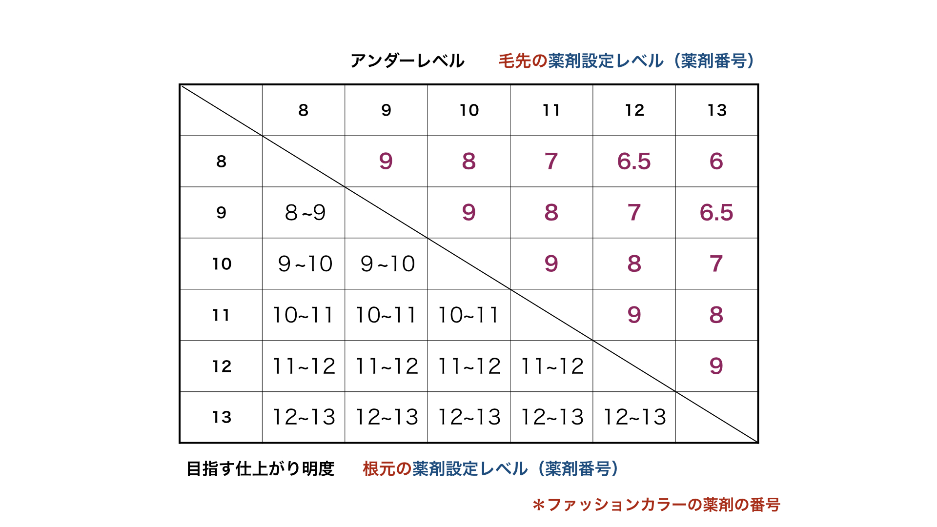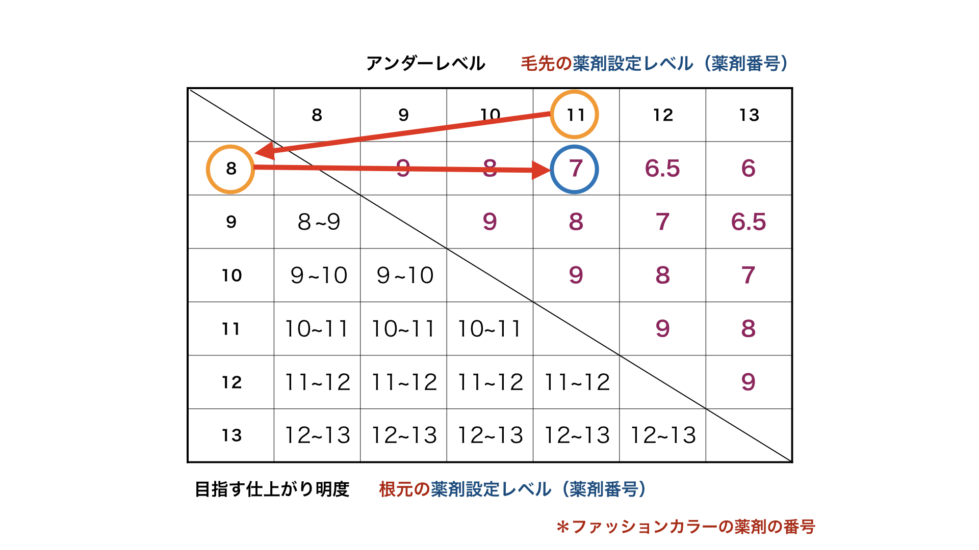 毛先が11レベルで黄色くなってきていたら、8レベルの番号の薬剤を使うと約7レベルに仕上がる。カンタンでしょう?