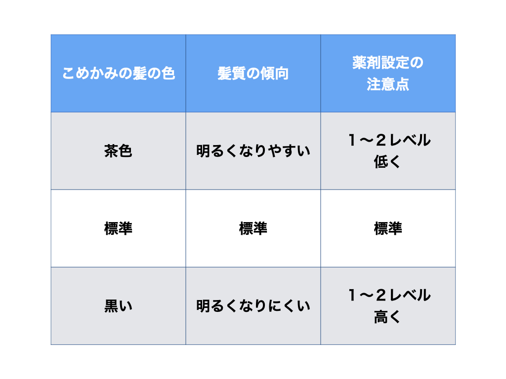 というのもこめかみの髪は誰でも細い髪で、その人の色素の傾向がわかりやすいからです。