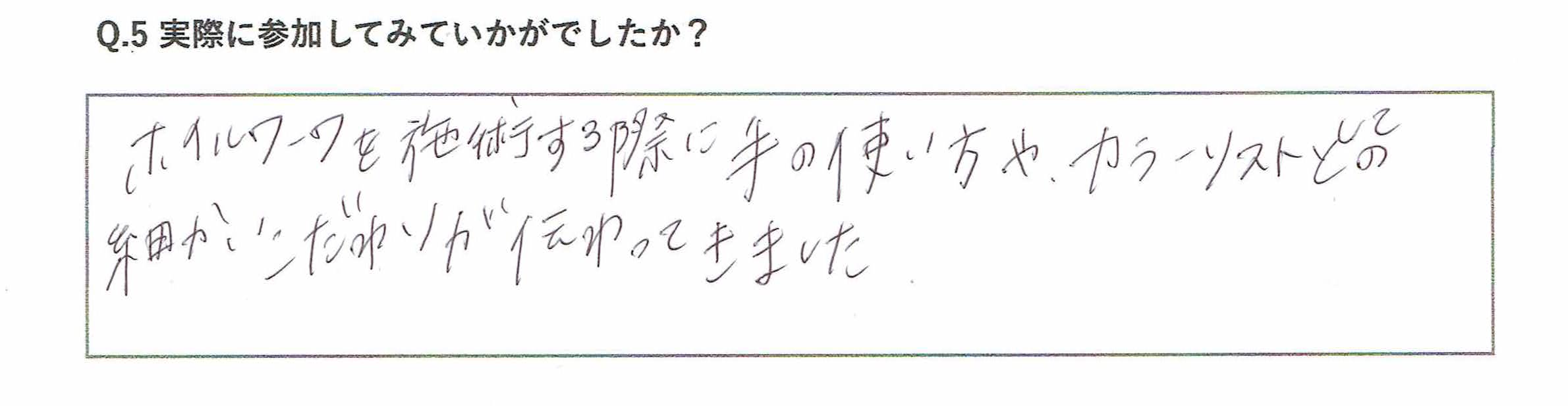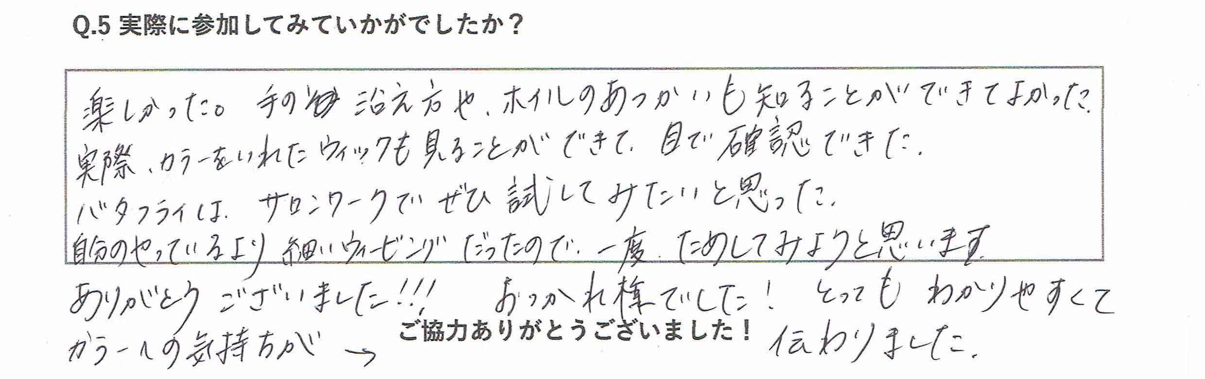 楽しかった。手の添え方やホイルの扱いも知ることができてよかった。実際にカラーされたウィッグもいることができて目で確認できた。