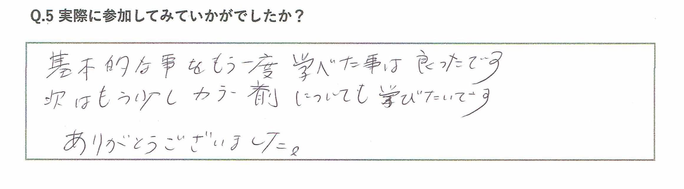 基本的なことを学べて良かったです。次はもう少しカラー剤についても知りたいです。