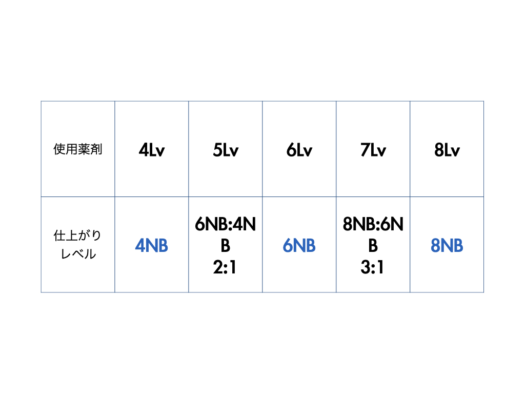 *特に明るくなりにくい・白髪が染まりにくい髪質はN12:4NB 3:2 で約8レベルの仕上がりになります。