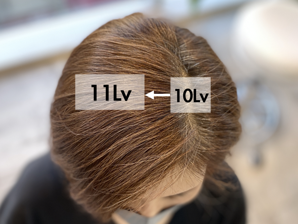 理由は根元の方が毛量が多く既染部に合わせようとしすぎると根元だけ明るくなって失敗するからです。