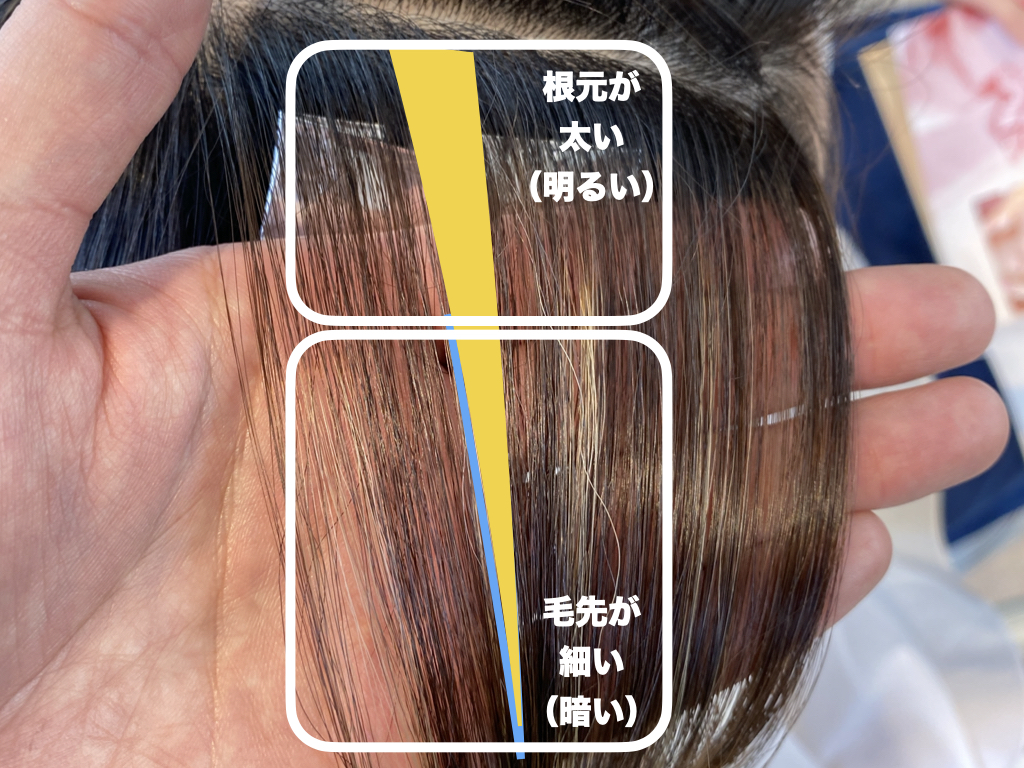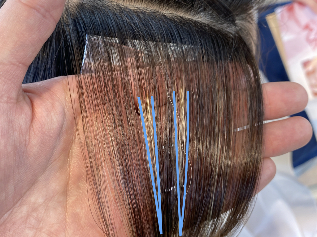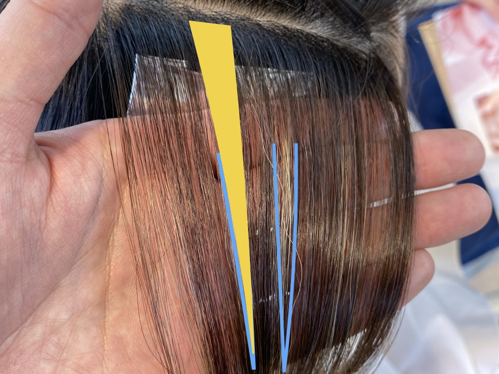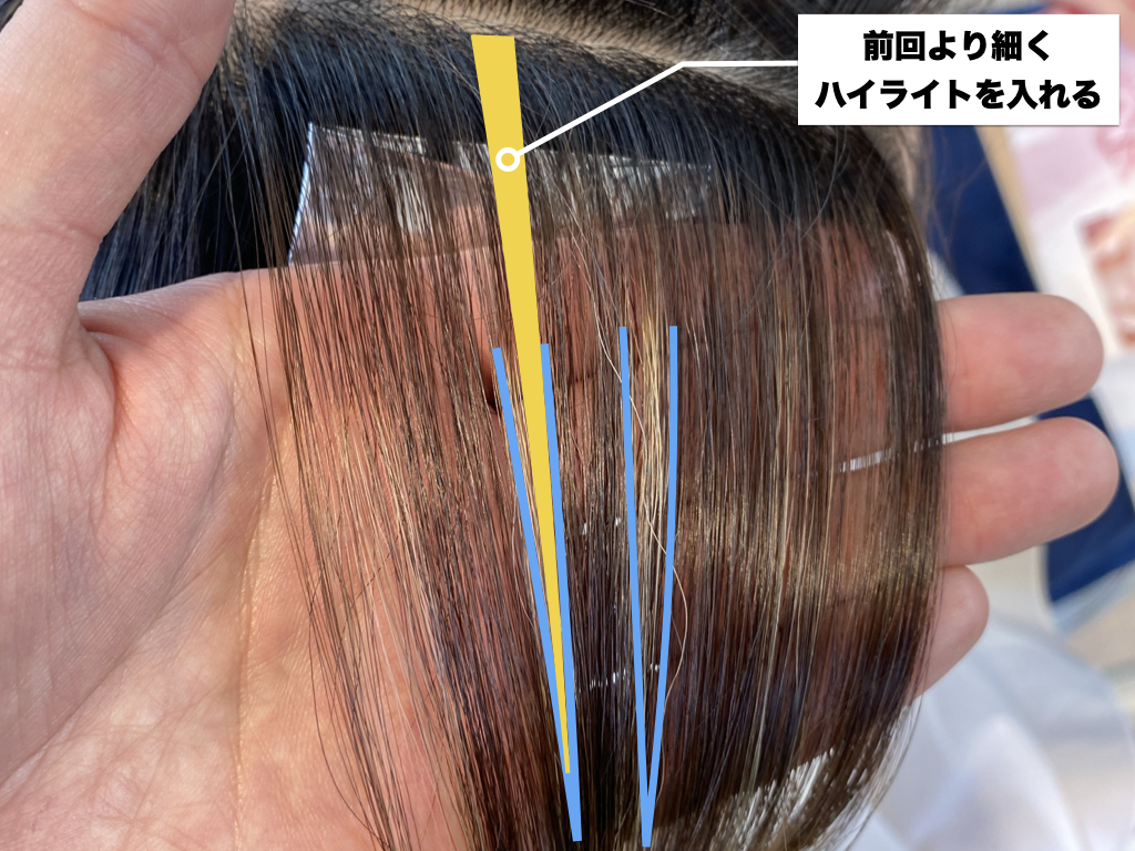 同じ太さで入れていくと、前回のハイライトがカットで削られて細くなっていくのに根元だけ太いハイライトになってしまうから!