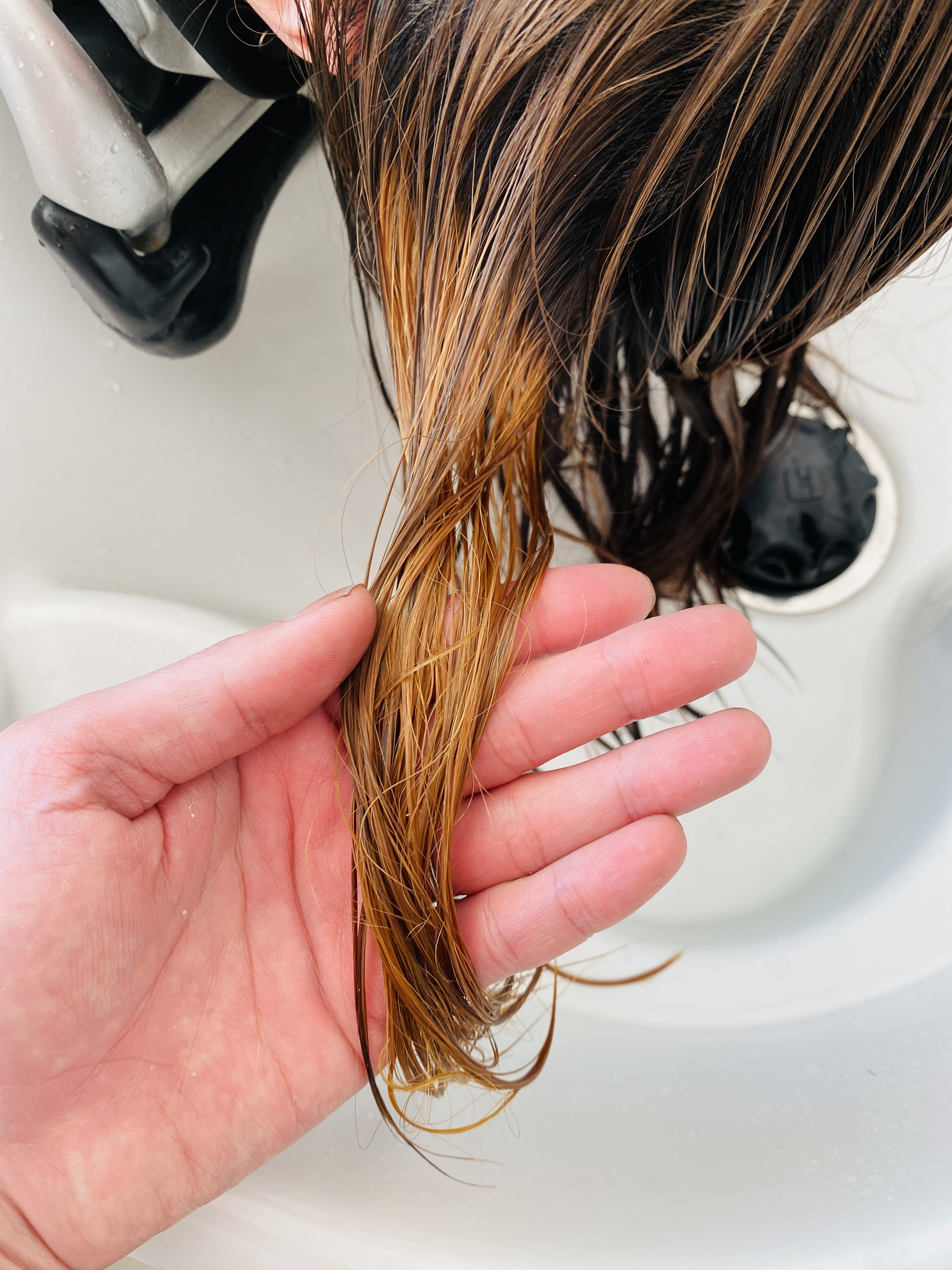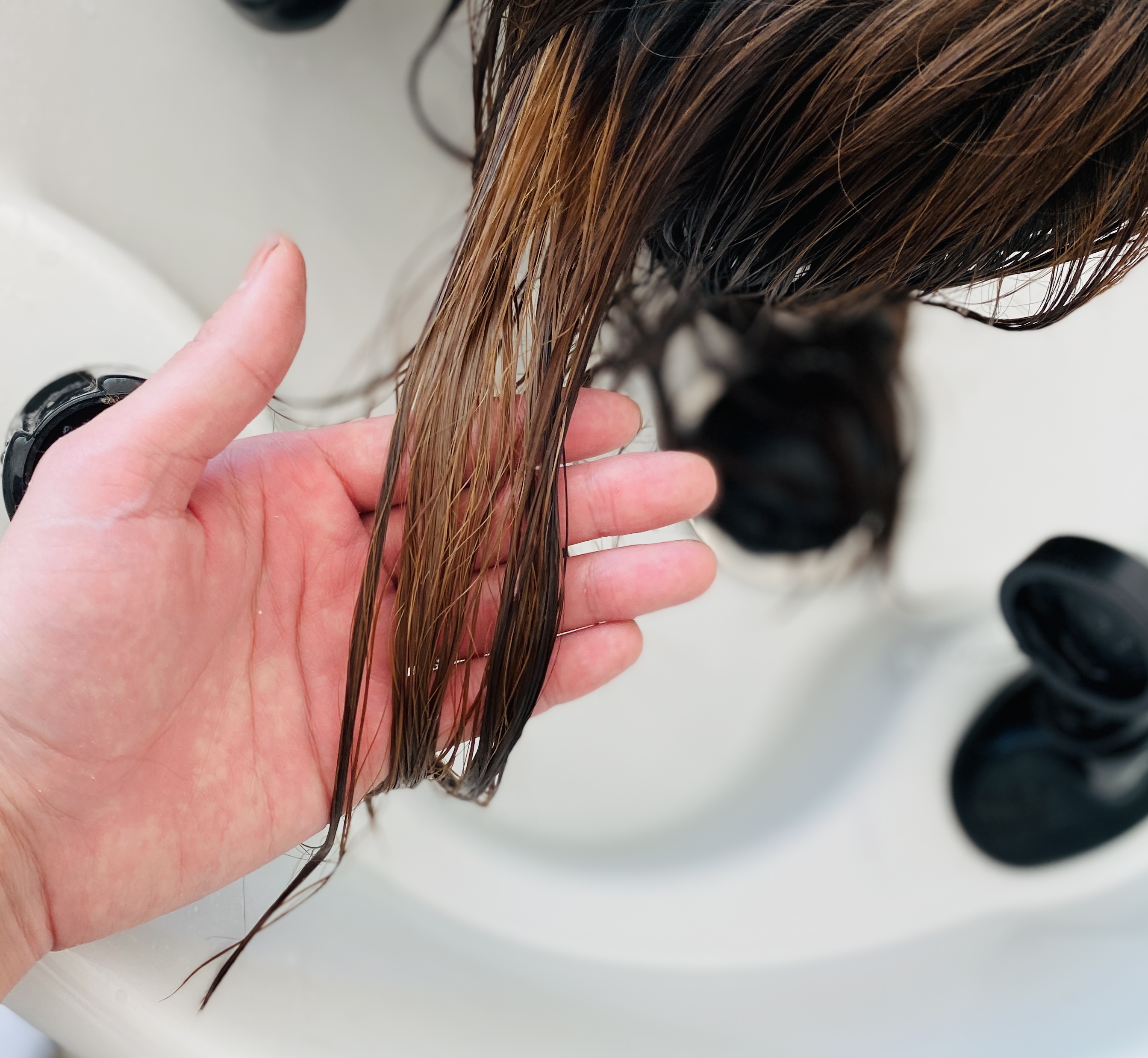 黄みが飛んでくすみ感が出たら流して軽くシャンプーし、お席でメインのカラーに入ります。