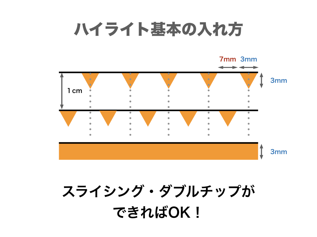 ハイライトを太くしないと毛先までラインが出ないから・・